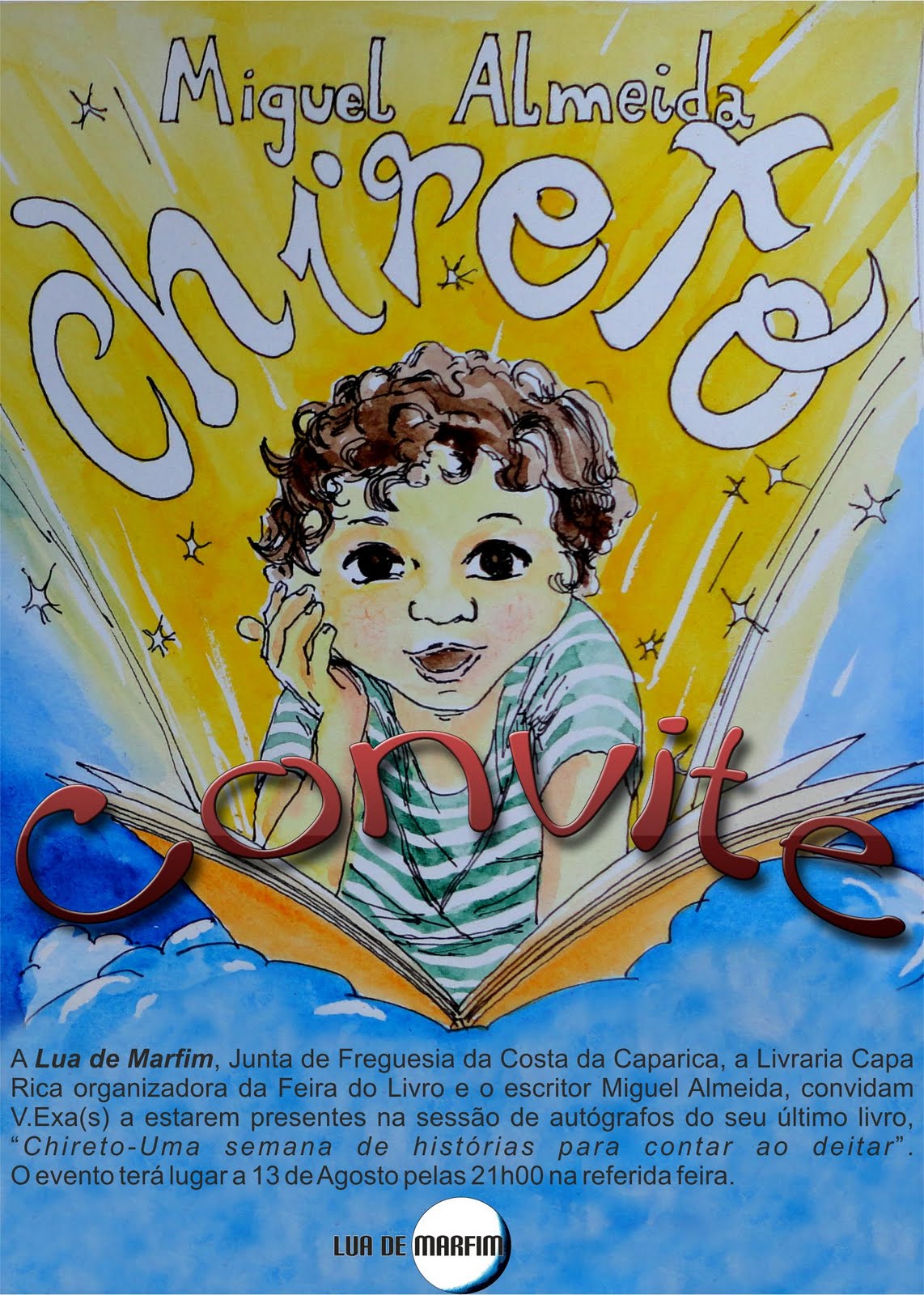 A Lua de Marfim, Junta de Freguesia da Costa da Caparica,a Livraria Capa Rica organizadora da Feira do Livro e o escritor Miguel Almeida, convidam V.Exa(s) a estarem presentes na sessão de autógrafos do seu último livro, “Chireto-Uma semana de histórias para contar ao deitar”.