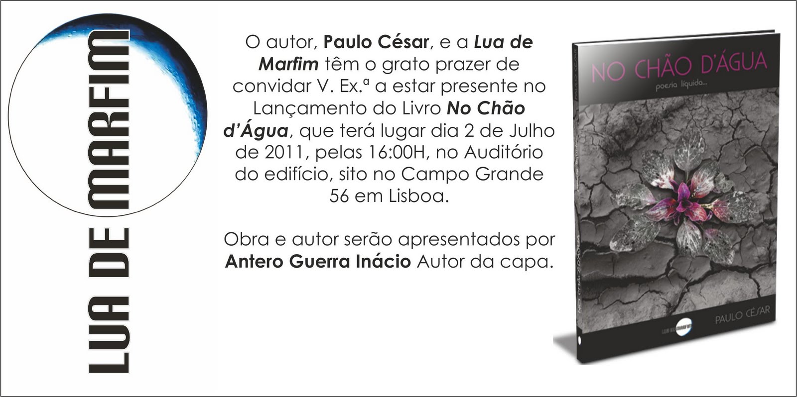 O poeta Paulo César, e a editora Lua de Marfim têm o grato prazer de convidar V. Ex.ª a estar presente no lançamento da sua obra de Poesia, “No chão d´água”. Este evento terá lugar no dia 2 de Julho de 2011, pelas 16.00H, no Auditório do Campo Grande, 56, em Lisboa.