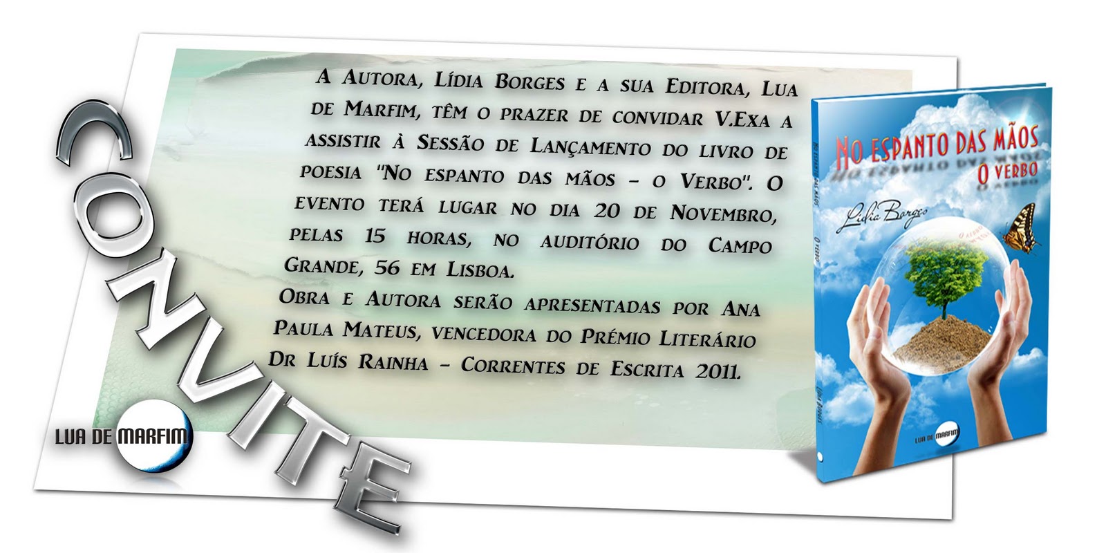 "O Autor Fernando Saiote e a sua Editora, Lua de Marfim, têm o prazer de convidar V.Exa a assistir à apresentação do livro de poesia, "Prisão de sentidos".