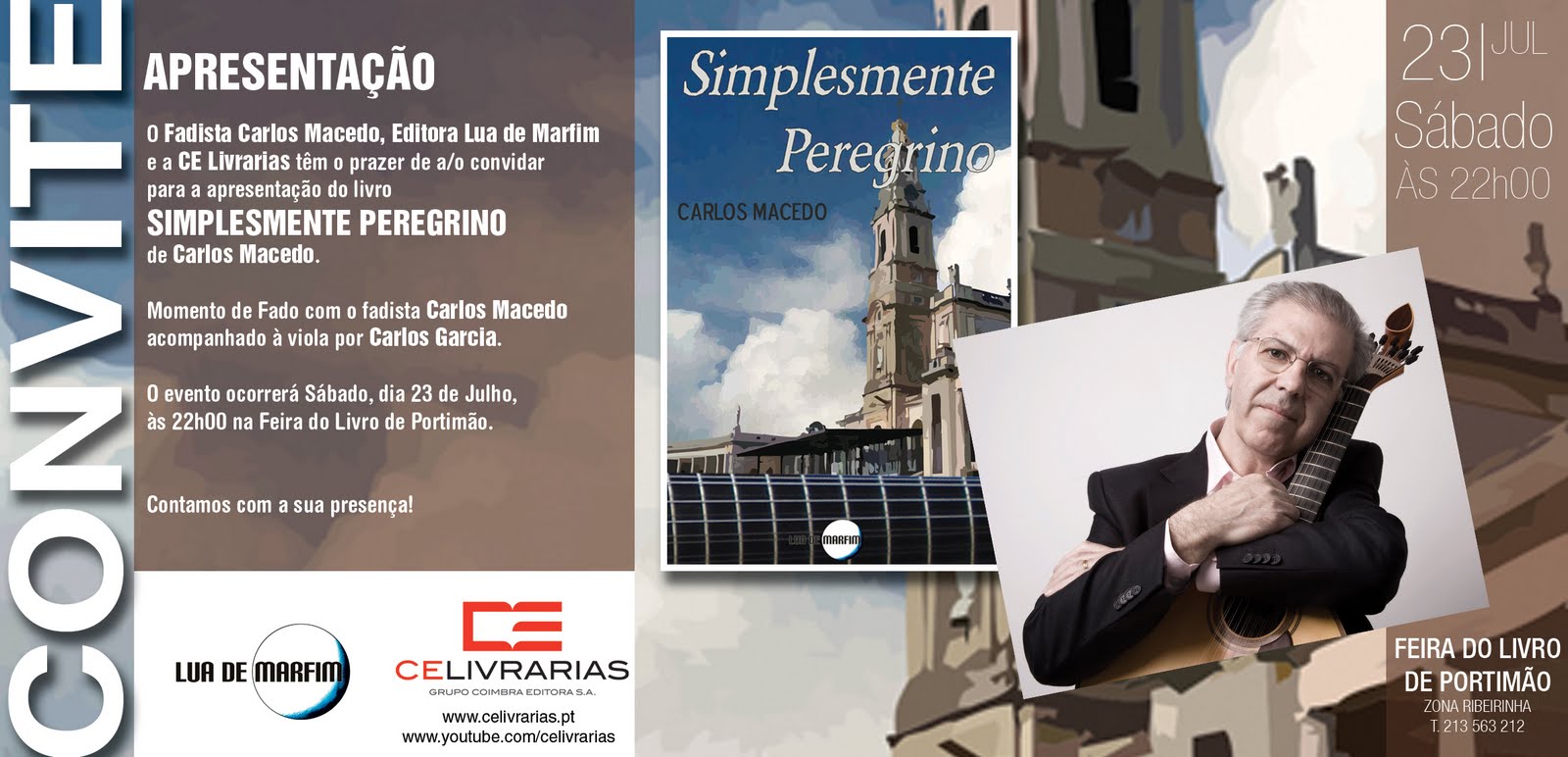 O Fadista Carlos Macedo, a editora Lua de Marfim e a CE Livrarias têm o prazer de a/o convidar para a apresentação do livro “SIMPLESMENTE PEREGRINO” de Carlos Macedo.