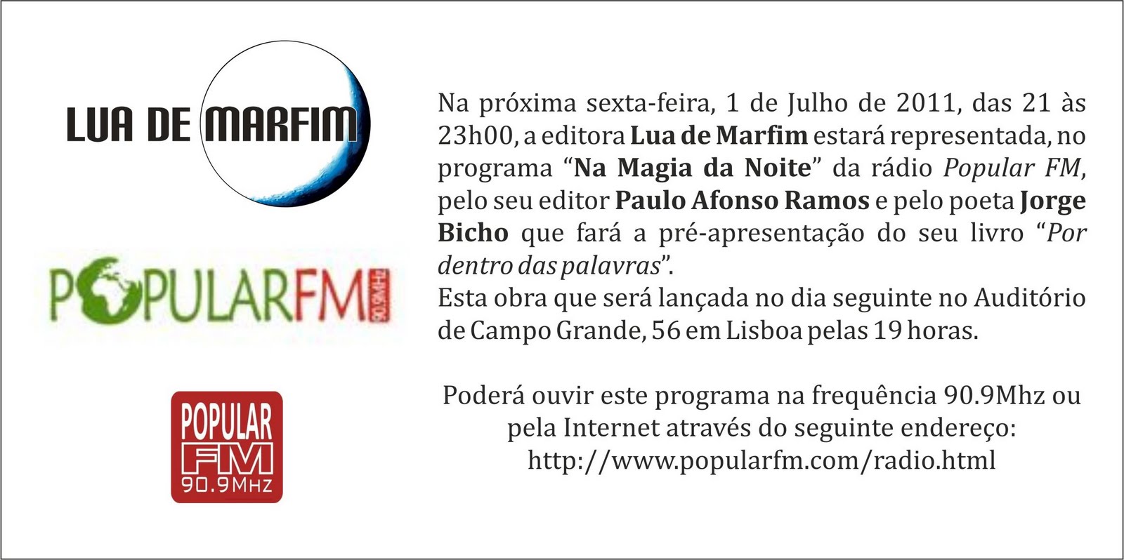 Na próxima sexta-feira, 1 de Julho de 2011, das 21,00h as 23,00h, a editora Lua de Marfim estará representada, no programa da rádio “Na Magia da Noite” da Rádio Popular FM, pelo seu editor