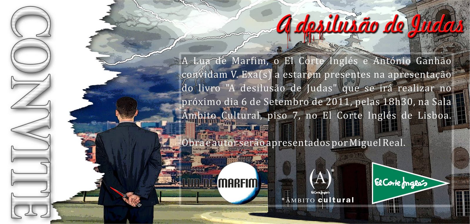 A Lua de Marfim, o El Corte Inglés e António Ganhão convidam V. Exa(s) a estarem presentes na apresentação do livro "A desilusão de Judas" que se irá realizar no próximo dia 6 de Setembro de 2011, pelas 18h30, na Sala Âmbito Cultural, piso 7, no El Corte Inglés de Lisboa.