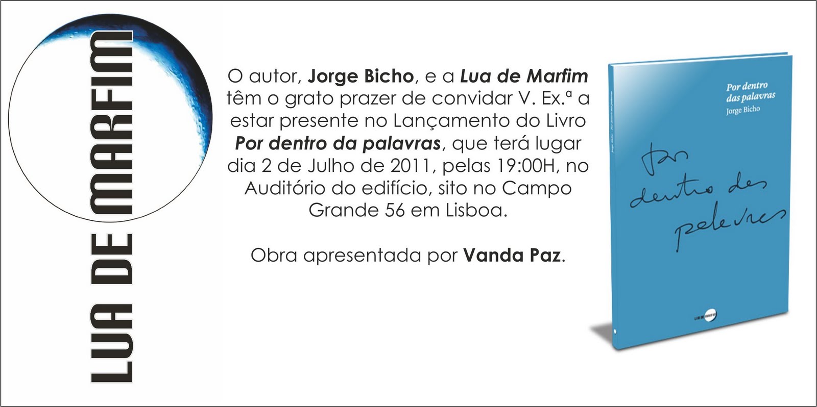O poeta Jorge Bicho, e a editora Lua de Marfim têm o grato prazer de convidar V. Ex.ª a estar presente no lançamento da sua obra de Poesia, “Por dentro das palavras”. Este evento terá lugar no dia 2 de Julho de 2011, pelas 19.00H, no Auditório do Campo Grande, 56, em Lisboa.