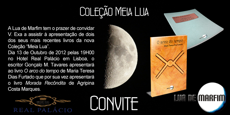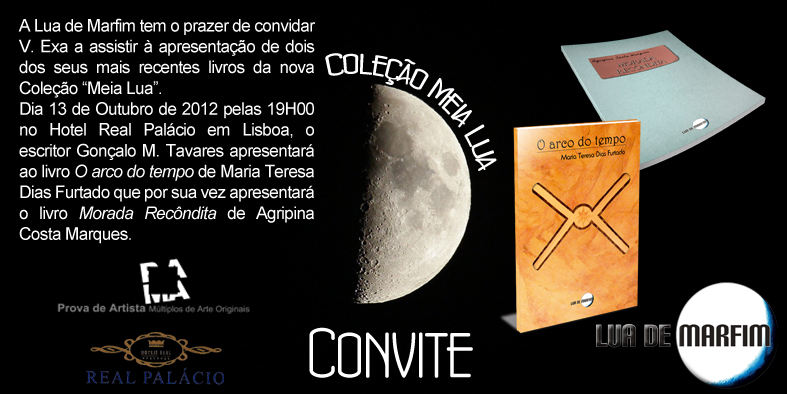 Dia 13 de Outubro de 2012 pelas 19 horas no Hotel Real Palácio em Lisboa, o escritor Gonçalo M. Tavares apresentará ao livro “O arco do tempo” de Maria Teresa Dias Furtado que por sua vez apresentará o livro “Morada Recôndita” de Agripina Costa Marques.